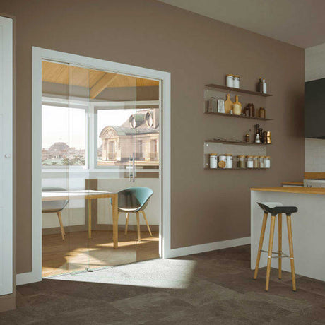 De Vetro Remix schuifdeur van Scrigno Het is een veelzijdig model dat de inspiratie van eerdere oplossingen combineert met een innovatieve visie. Dit ontwerp is solide, duurzaam en stabiel, en zorgt ervoor dat de deur soepel opent en sluit. Met een elegant gebaar verdwijnt het in de muur en verschijnt het weer wanneer dat nodig is. De glazen deur voor Remix vertegenwoordigt een complete en volwassen oplossing dankzij de ruime keuzemogelijkheden.