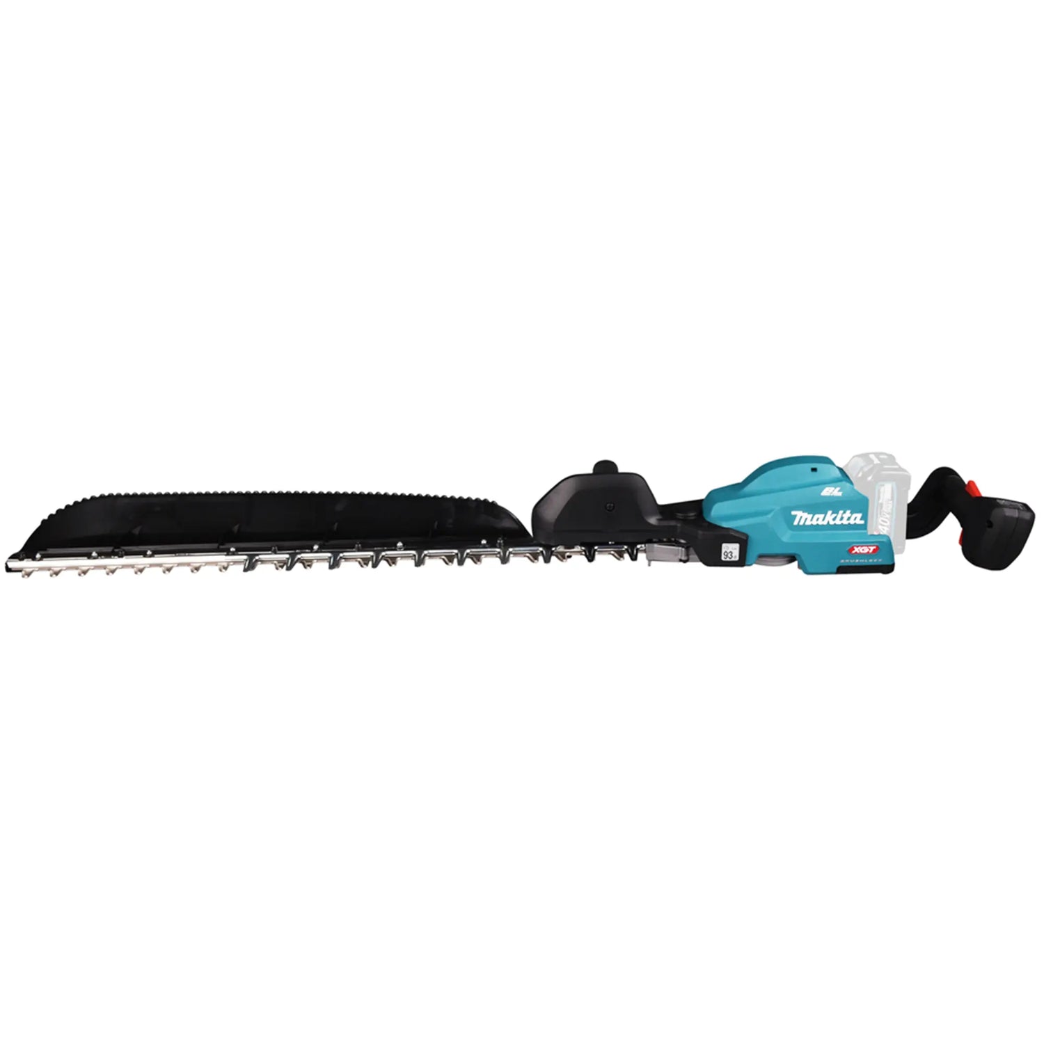 De heggenschaar Makita UH014GZ 40V, de nieuwe telg in de XGT-familie, met een vermogen dat gelijk is aan dat van een 720W-gereedschap en een zaagblad dat tot 75 cm lang is.